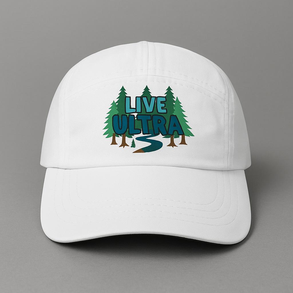 Featuring the signature LIVE ULTRA graphic surrounded by evergreen trees and a winding trail, this hat is a reminder to stay in pursuit—of goals, grit, and the long path ahead. Whether you’re training, racing, or exploring, it brings motivation with every stride.